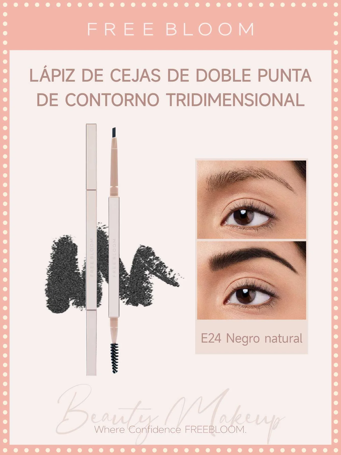 Lápiz de cejas de doble punta resistente al agua y de larga duración, un extremo usa una recarga retráctil ultrafina y el otro extremo usa un cepillo de peinado natural de enfoque suave. La punta del lápiz triangular tridimensional delinea suavemente la forma de las cejas, Incluye Cepillo para suavizar el flujo del vello y dibujar de forma natural una forma tridimensional y viva de las cejas.